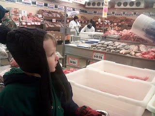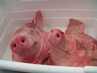 I was actually somewhat concerned that it might bother Henry, my four year old son, who made the trip with me, given that, in many of the books we read him, piggies and cows are cute barnyard animals that talk, sing, or drive the school bus. But it didn't. After we got back, my wife asked him what he liked best about the place and he said, enthusiastically, "the pig heads!"