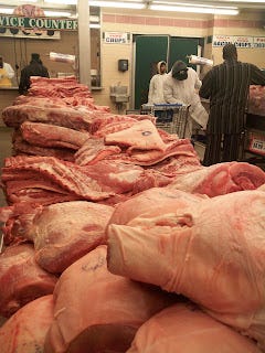 A visit to Peoria Packing will cause one to ponder these things, because once you enter the butcher shop wing of this small grocery store across the street from their commercial packing house, you will be confronted with MEAT in a way that not too many Americans are accustomed to.